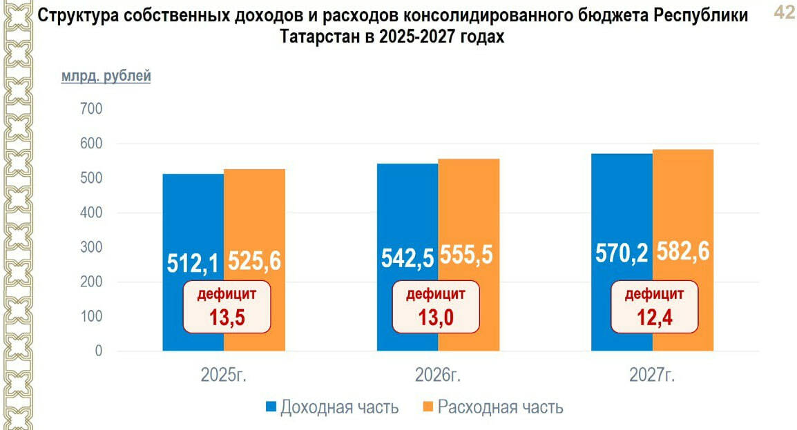 «На 2025 год параметры консолидированного бюджета прогнозируются такими: доходы в сумме 512,1 млрд рублей, расходы 525,6 млрд рублей, дефицит 13,5 млрд рублей», – огласил Файзрахманов.