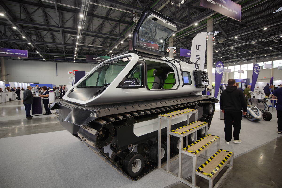 Одним из самых ярких экспонатов стал гусеничный гибридный вездеход, расположившийся почти в центре экспозиции. По словам автора проекта, такой вездеход может передвигаться по болотам и практически любому бездорожью со скоростью до 50 километров в час.