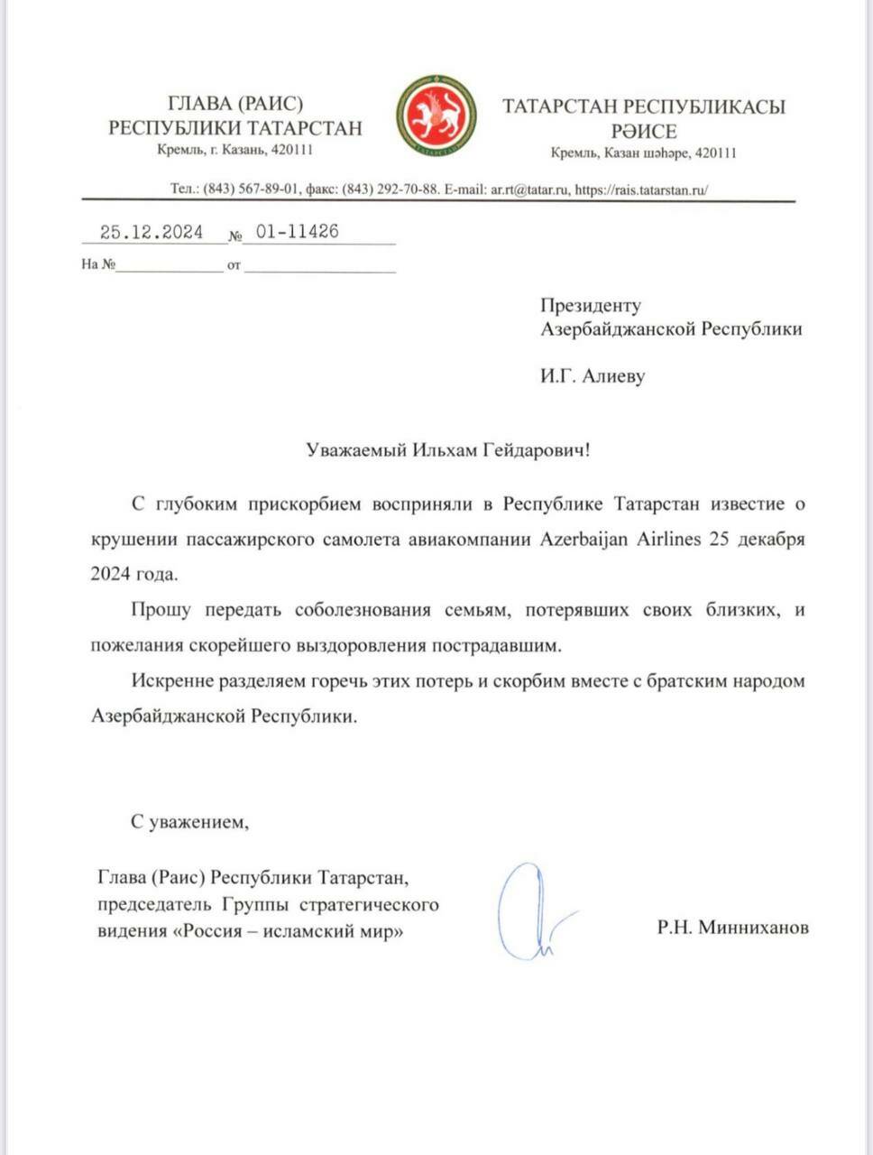 «С глубоким прискорбием восприняли в Республике Татарстан известие о крушении пассажирского самолета авиакомпании Azerbaijan Airlines 25 декабря 2024 года», — подчеркнул Рустам Минниханов.