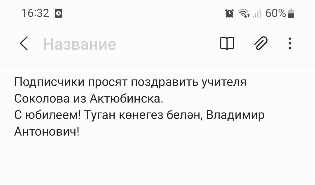 «Подписчики просят поздравить учителя Соколова из Актюбинска. С юбилеем! Туган көнегез белән („С Днем рождения“ по-татарски — прим. Т-и), Владимир Антонович!» — написал Президент РТ, выложив скриншот с текстом поздравления.