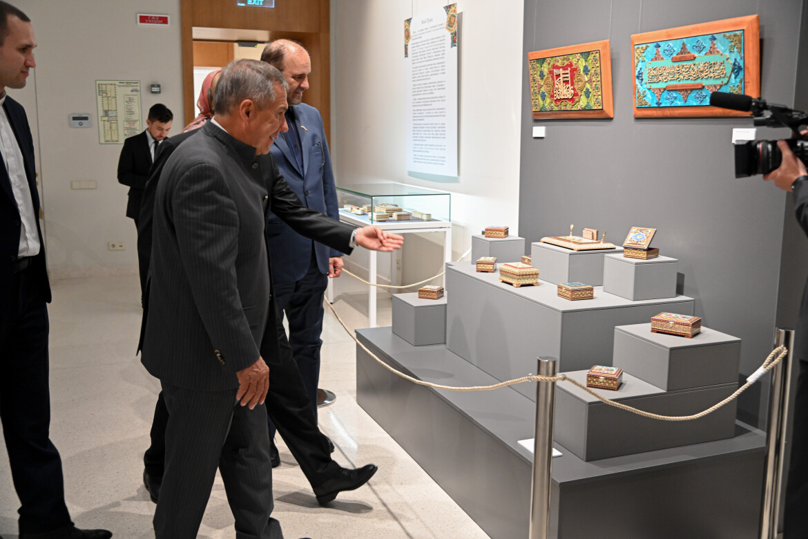 После переговоров они посетили выставку «Мой Иран», которая проходит в Присутственных местах Казанского Кремля. Здесь представлены различные изделия иранских мастеров: роспись по эмали, инкрустация по дереву, инкрустация бирюзой, чеканка, каллиграфия, ковроткачество, ткани ручной работы, выполненные в технике «терме», миниатюра и работы каллиграфов.