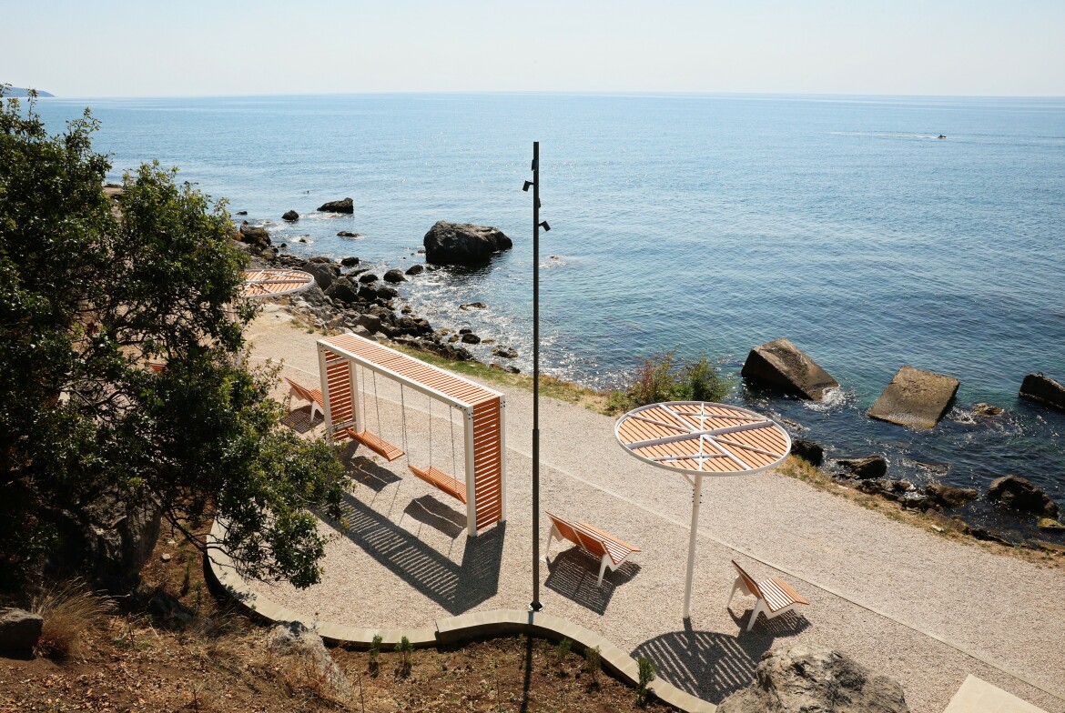 В береговой зоне, которая прилегает к клубу и скверу, поставили навесы и шезлонги. Проект благоустройства был разработан так, что на территории сохранились реликтовые насаждения.