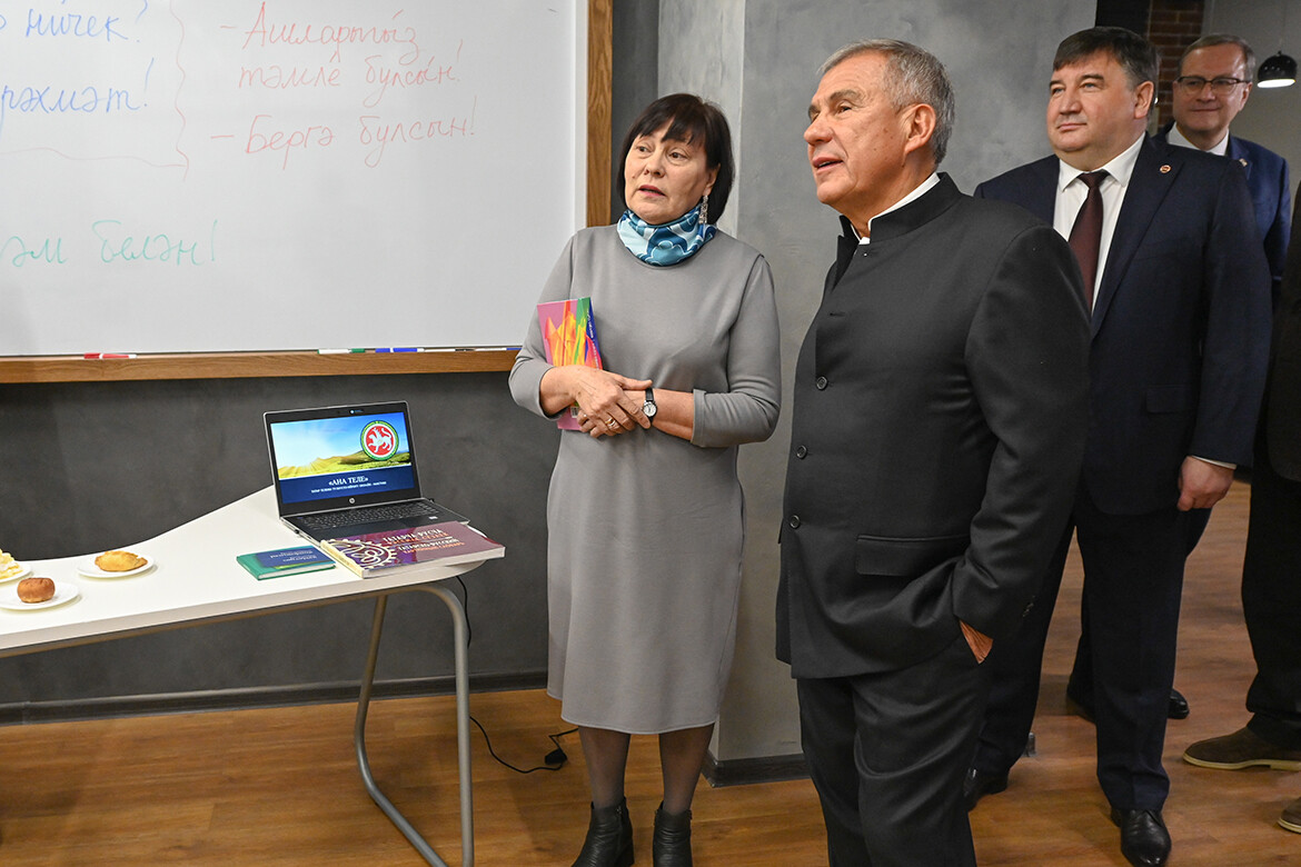 Во время посещения Казанского университета Президент Татарстана осмотрел выставку со студенческими проектами. О своей работе руководителю республики рассказали представители Центра студенческих отрядов, Волонтерского штаба, научных кружков. Один из проектов был посвящен учебнику татарского языка для иностранных студентов. По словам доцента кафедры общего языкознания и тюркологии ИФМК КФУ Кадрии Фатхулловой, учащиеся из других стран охотно тянутся к изучению местного языка.