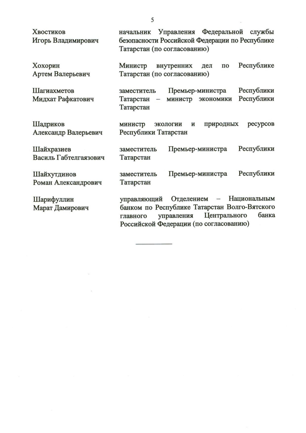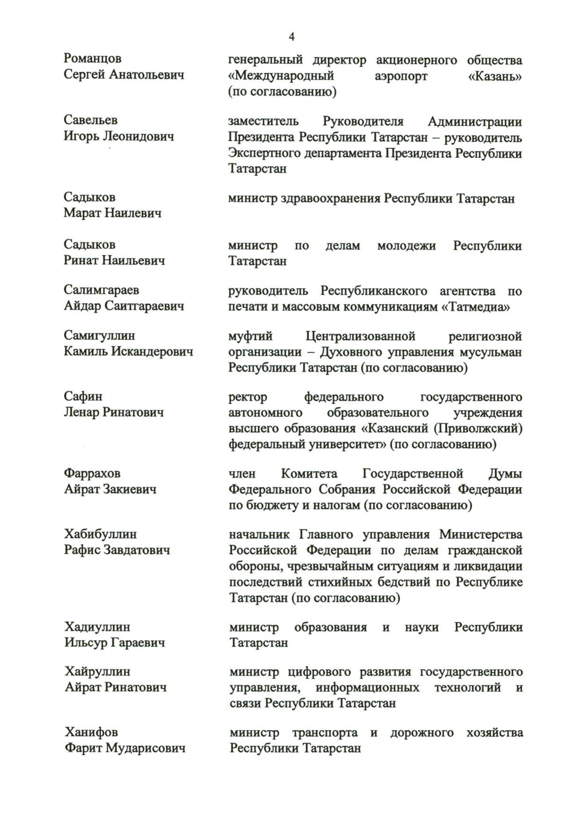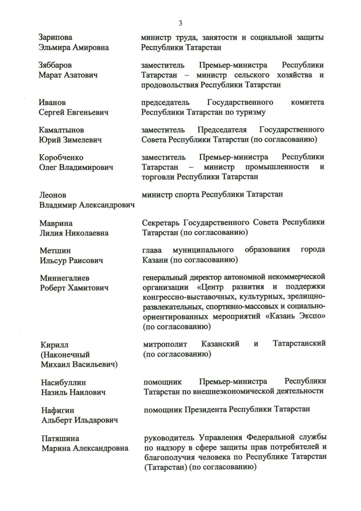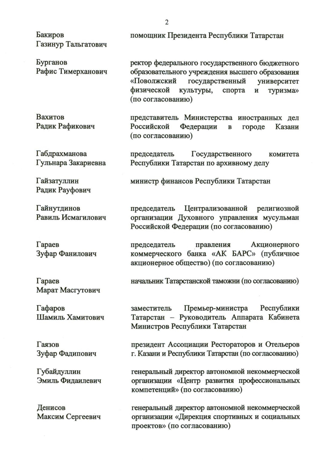 Рустам Минниханов назначен председателем, его заместителями стали Премьер-министр Алексей Песошин и руководитель Администрации Президента РТ Асгат Сафаров. Также в состав вошли руководитель Агентства инвестиционного развития Талия Минуллина(секретарь), главы министерств и пр.