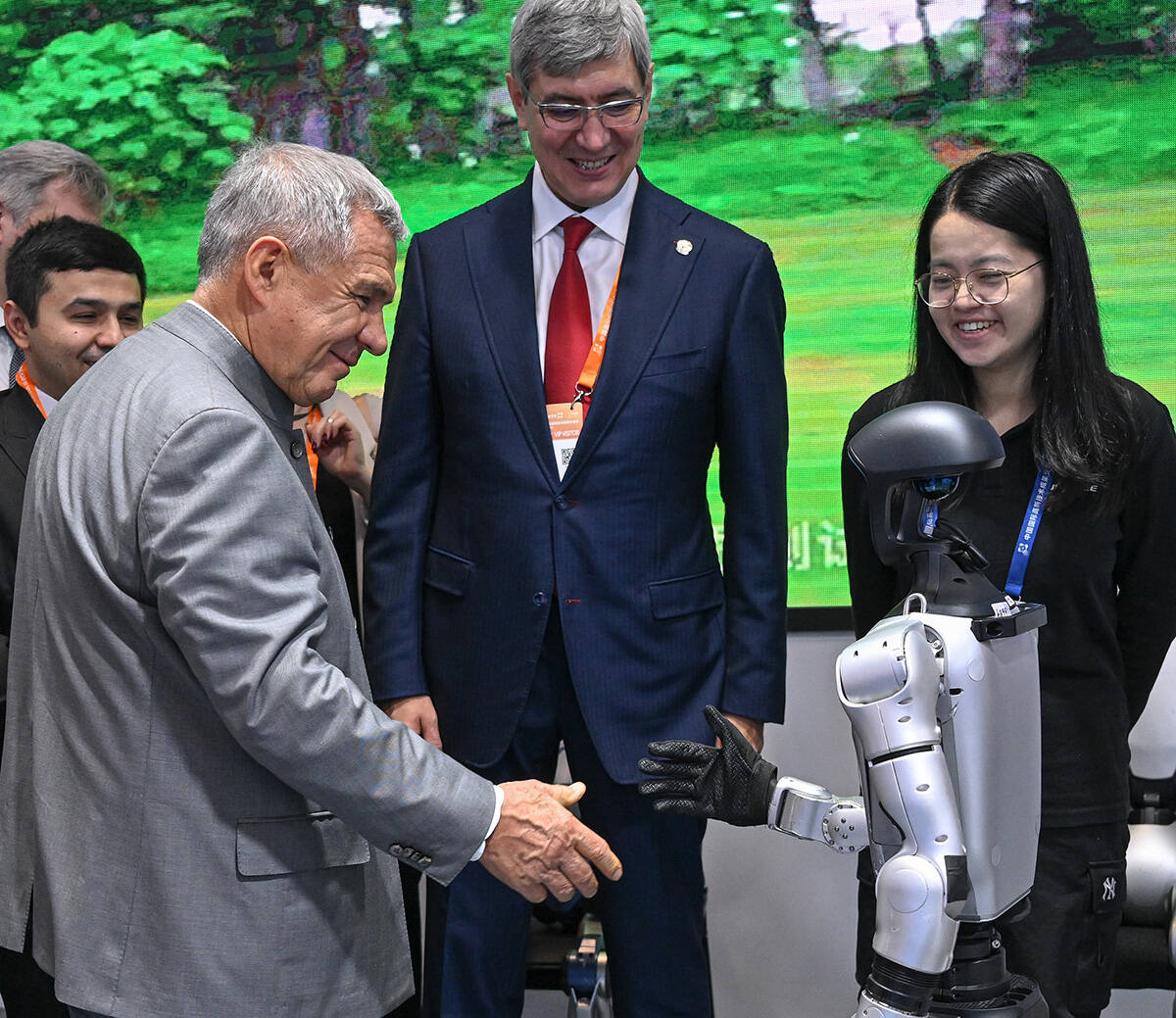 Особый интерес у делегации Татарстана вызвали человекоподобные роботы. Рустам Минниханов поздоровался с одним из них за руку, сообщила в своем телеграм-канале руководитель пресс-службы Раиса РТ Лилия Галимова.
