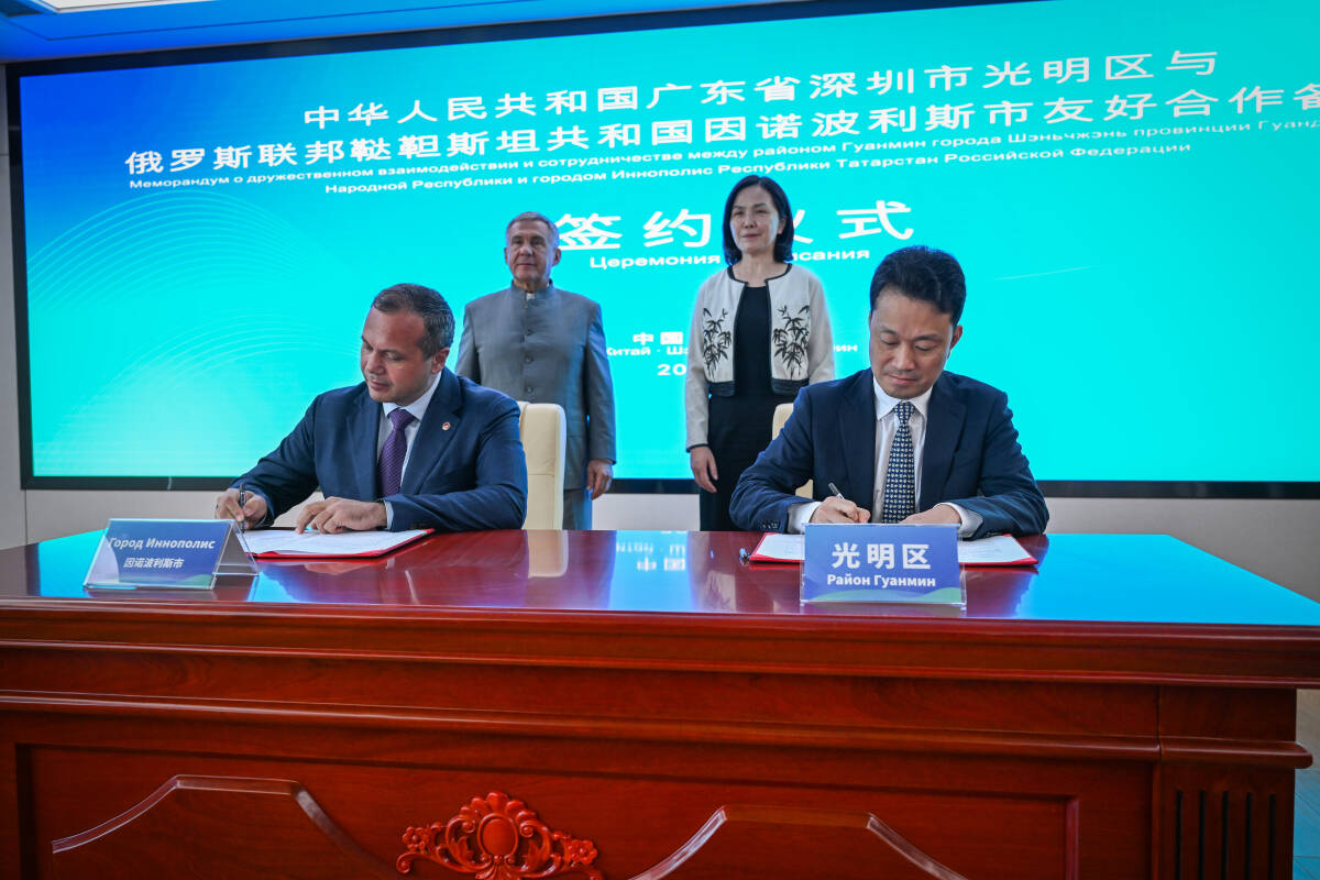 Также сегодня Рустам Минниханов принял участие в церемонии подписания соглашения о сотрудничестве между Иннополисом и китайским районом Гуанмин (входит в Шэньчжэнь). Свои подписи под документом поставили мэр татарстанского города Дмитрий Вандюков и шэньчжэньского района Цю Хаохан.
