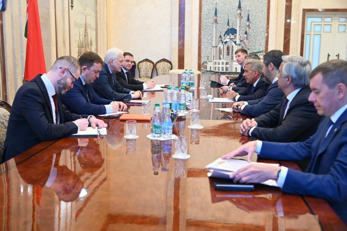 Раис Татарстана Рустам Минниханов сегодня встретился с чрезвычайным и полномочным послом РФ в Беларуси Борисом Грызловым. Они обсудили перспективы сотрудничества, отметив большой потенциал развития торговых отношений.