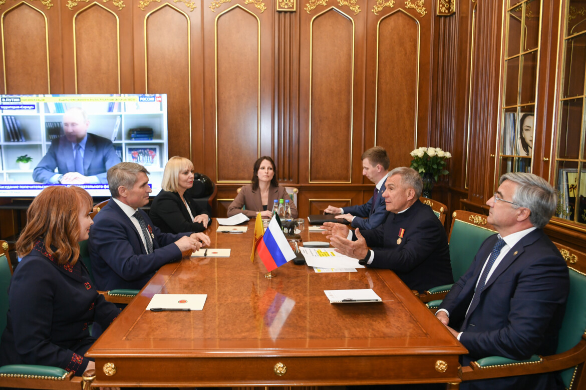 Рустам Минниханов вручил Олегу Николаеву татарстанскую медаль «100 лет образования ТАССР», а тот в свою очередь вручил ему памятную медаль, посвященную 80-летию строительства Сурского и Казанского оборонительных рубежей.