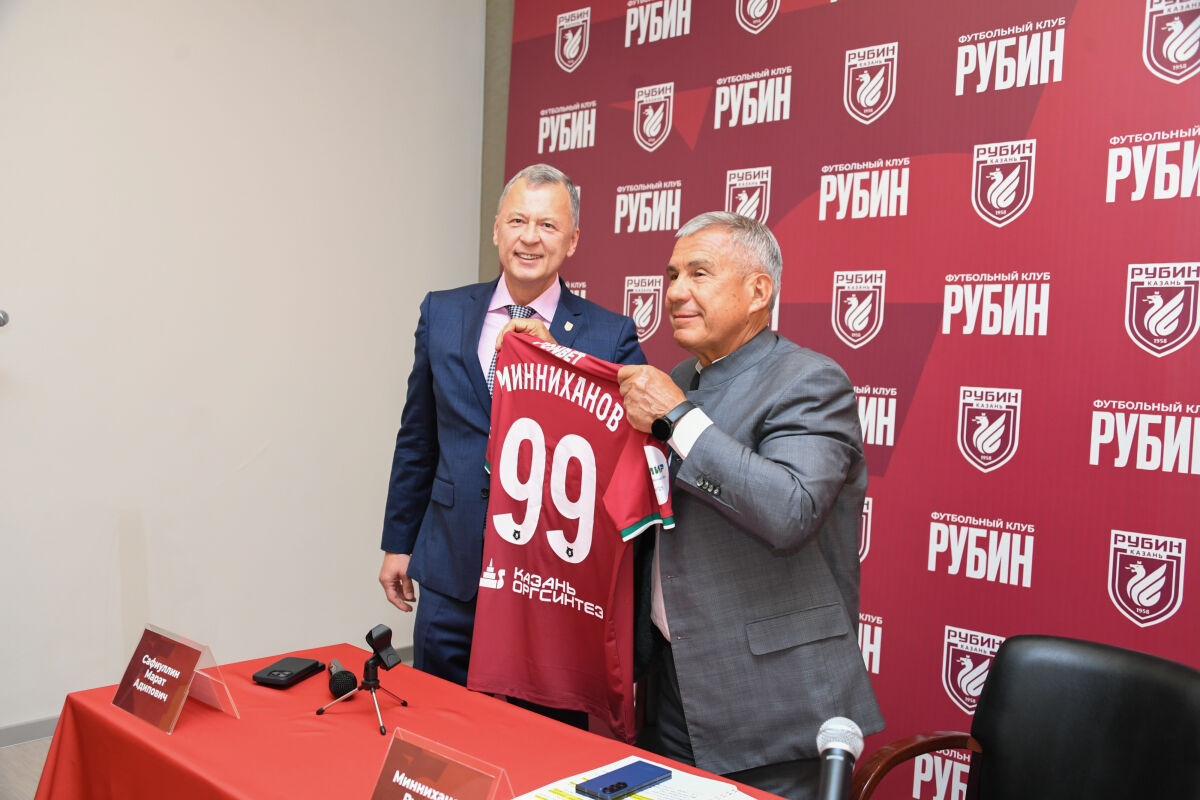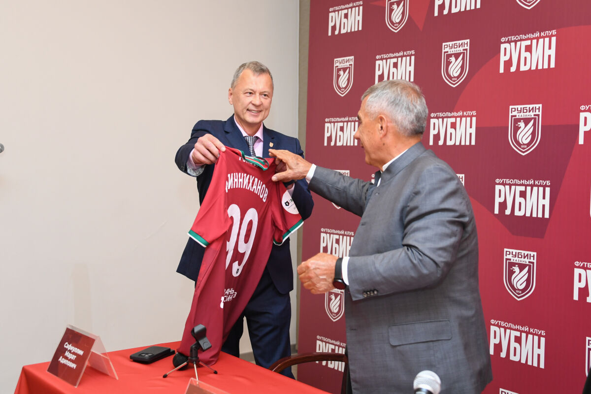 Раису Татарстана Рустаму Минниханову на встрече с игроками и тренерским штабом казанского футбольного клуба «Рубин» вручили клубную футболку с его фамилией и значок команды. Об этом сообщает пресс-служба руководителя республики.