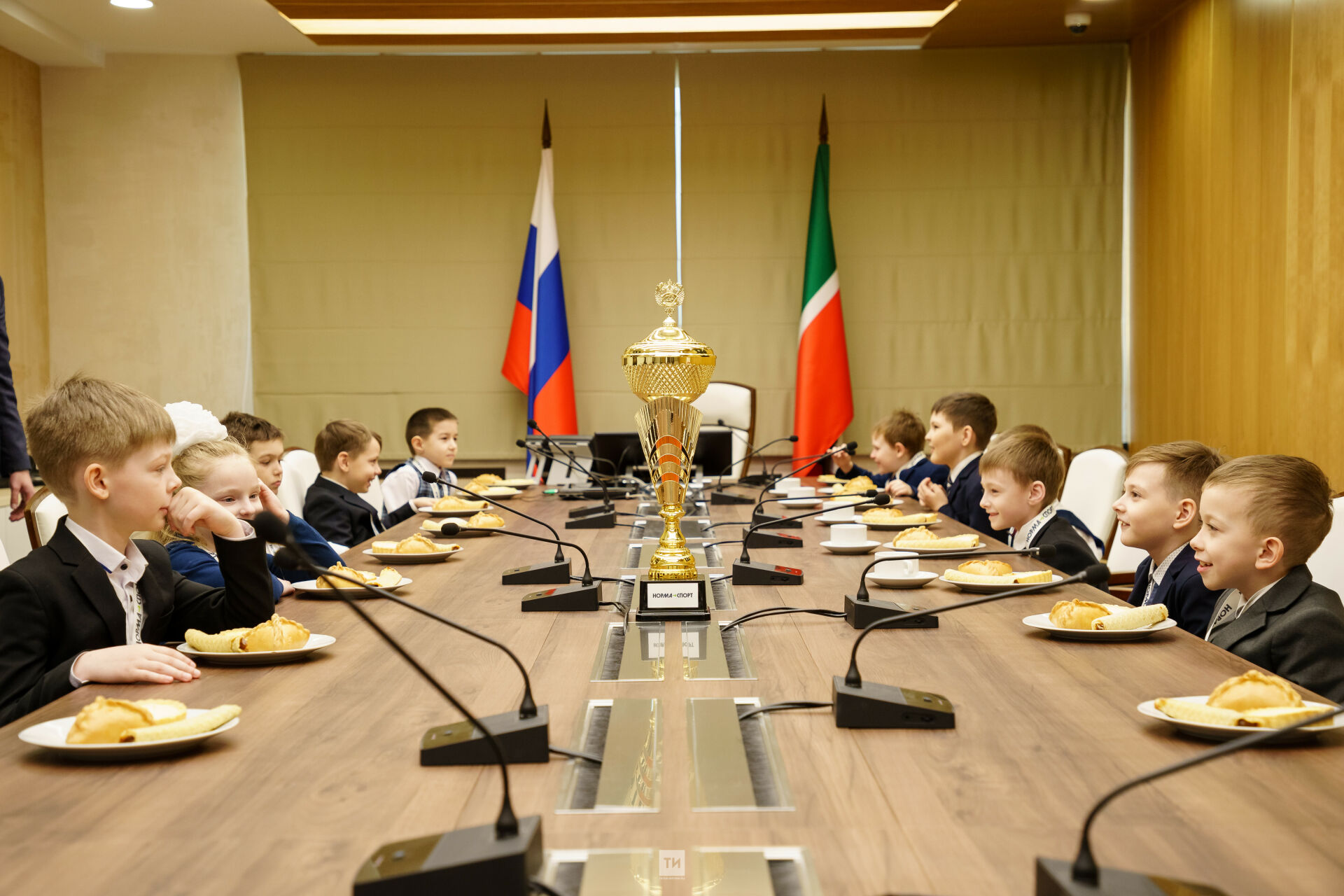 Ильдар Садриев побеседовал с командой чемпионов и наградил их и тренеров грамотами Министерства спорта Татарстана, после чего ребят ждало чаепитие.