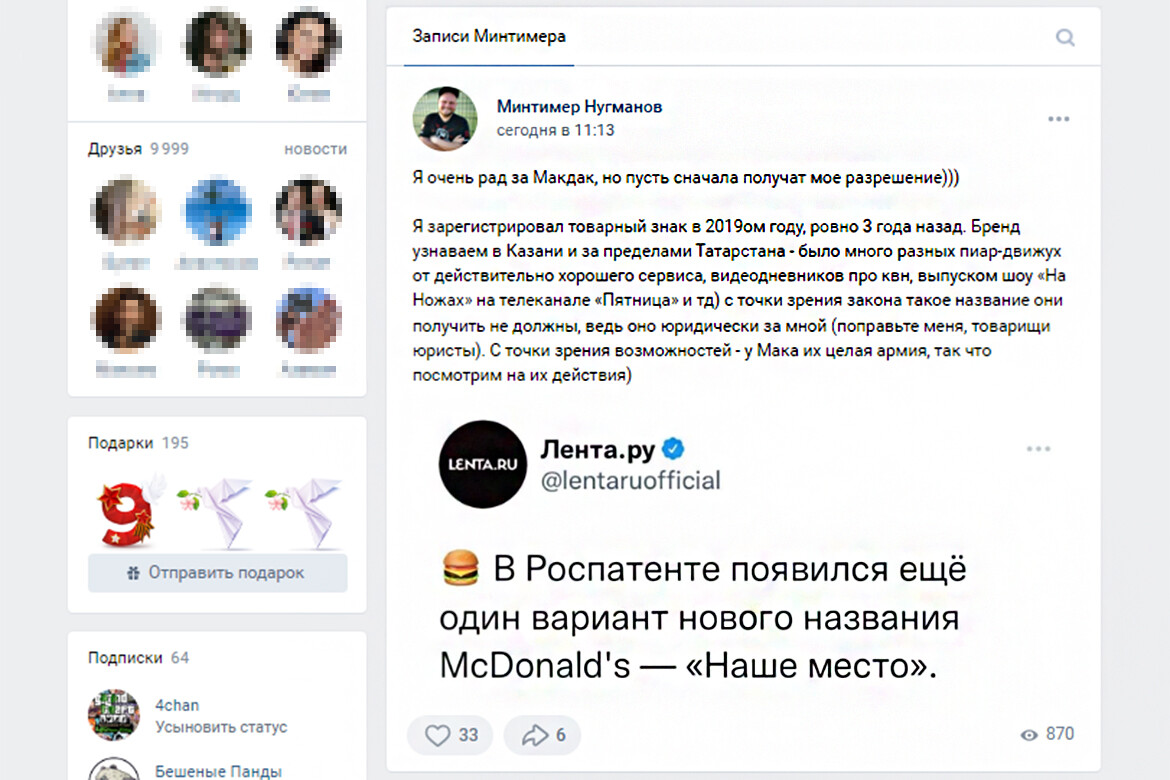 «Я очень рад за Макдак, но пусть сначала получат мое разрешение))) Я зарегистрировал товарный знак в 2019-ом году, ровно 3 года назад. Бренд узнаваем в Казани и за пределами Татарстана – было много разных пиар-движух от действительно хорошего сервиса, видеодневников про КВН, выпуском шоу «На Ножах» на телеканале «Пятница» и т.д.) с точки зрения закона такое название они получить не должны, ведь оно юридически за мной (поправьте меня, товарищи юристы). С точки зрения возможностей – у “Мака” их целая армия, так что посмотрим на их действия)», – написал в социальных сетях Нугманов (стиль и орфография автора сохранены).