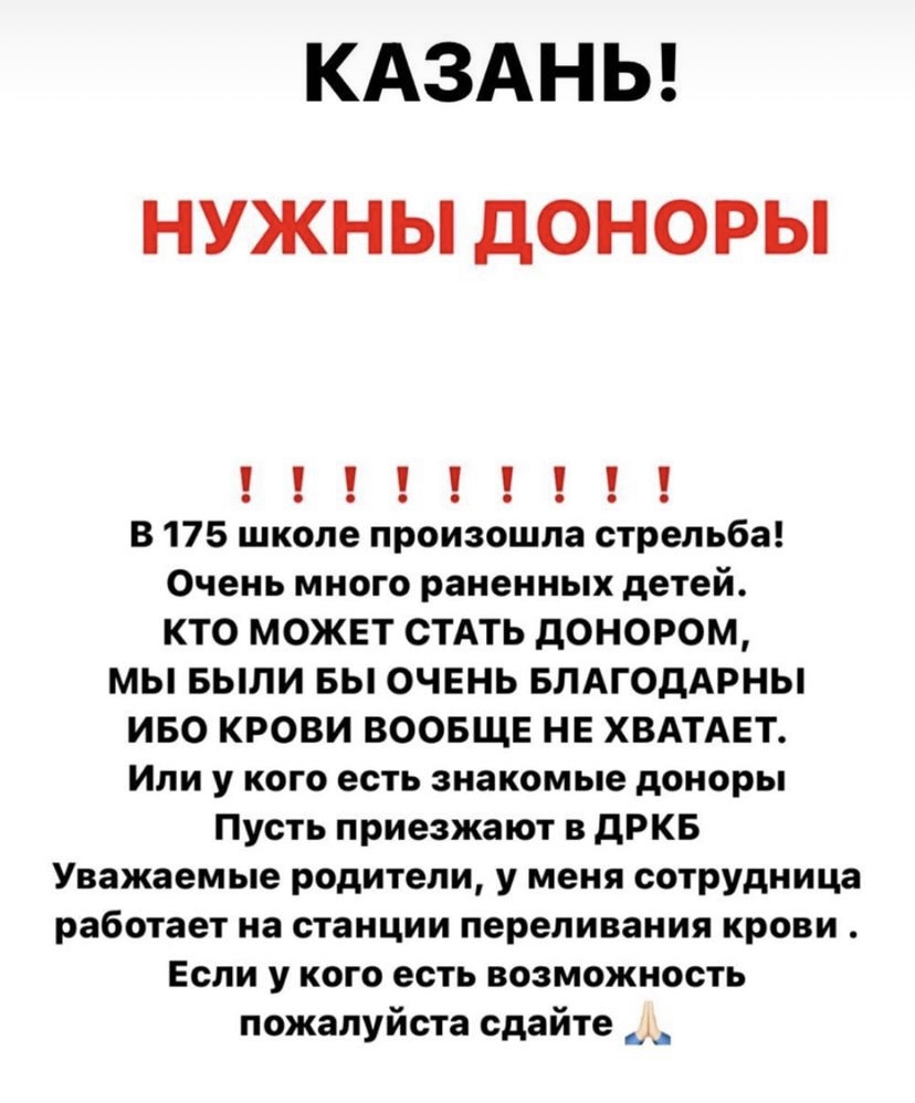 В социальных сетях и мессенджерах появились сообщения с призывами к татарстанцам сдавать кровь для переливания детям, которые пострадали в казанской гимназии №175. Однако в Министерстве здравоохранения Татарстана нехватку донорской крови не подтвердили.