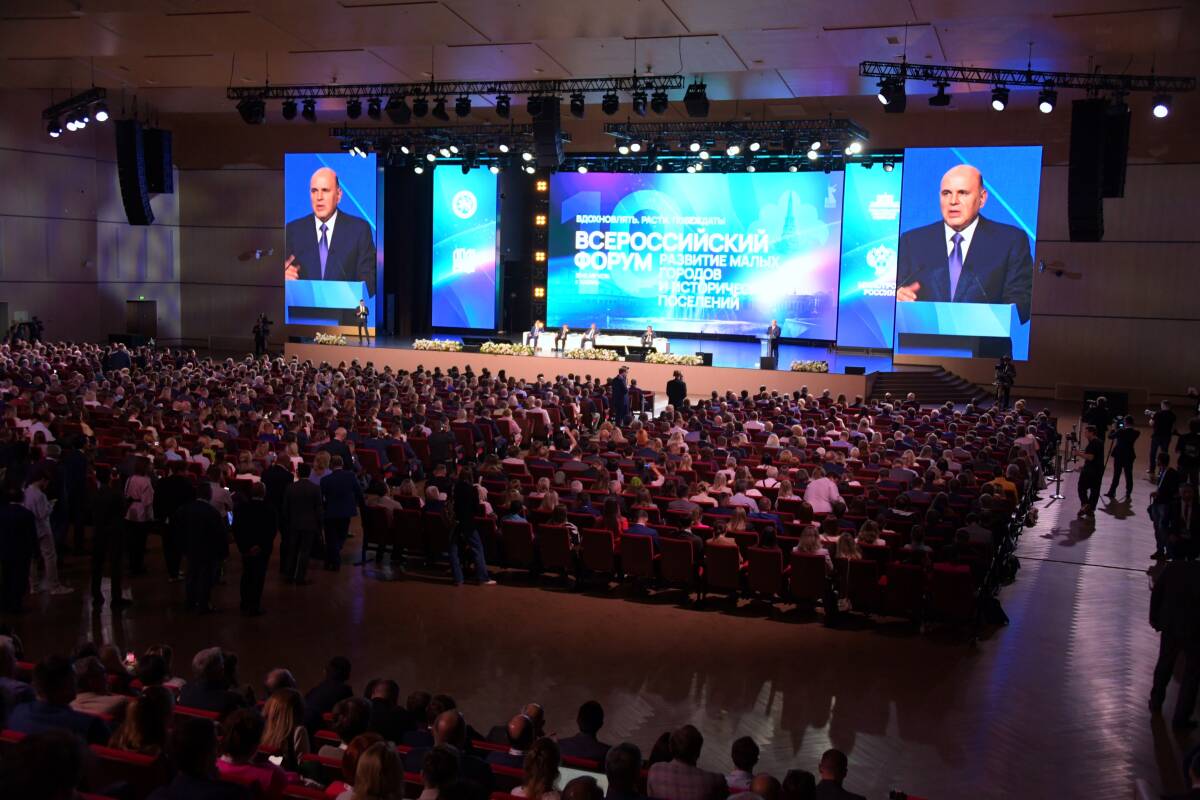 К началу пленарного заседания зал был заполнен, а российский премьер Михаил Мишустин начал выступать чуть раньше запланированного времени. Он поделился приятным впечатлением после обхода выставки «Город-сад» и рассказал о позитивных примерах Рыбинска, Бавлов, Старой Руссы, где команды управленцев перезапустили экономику.