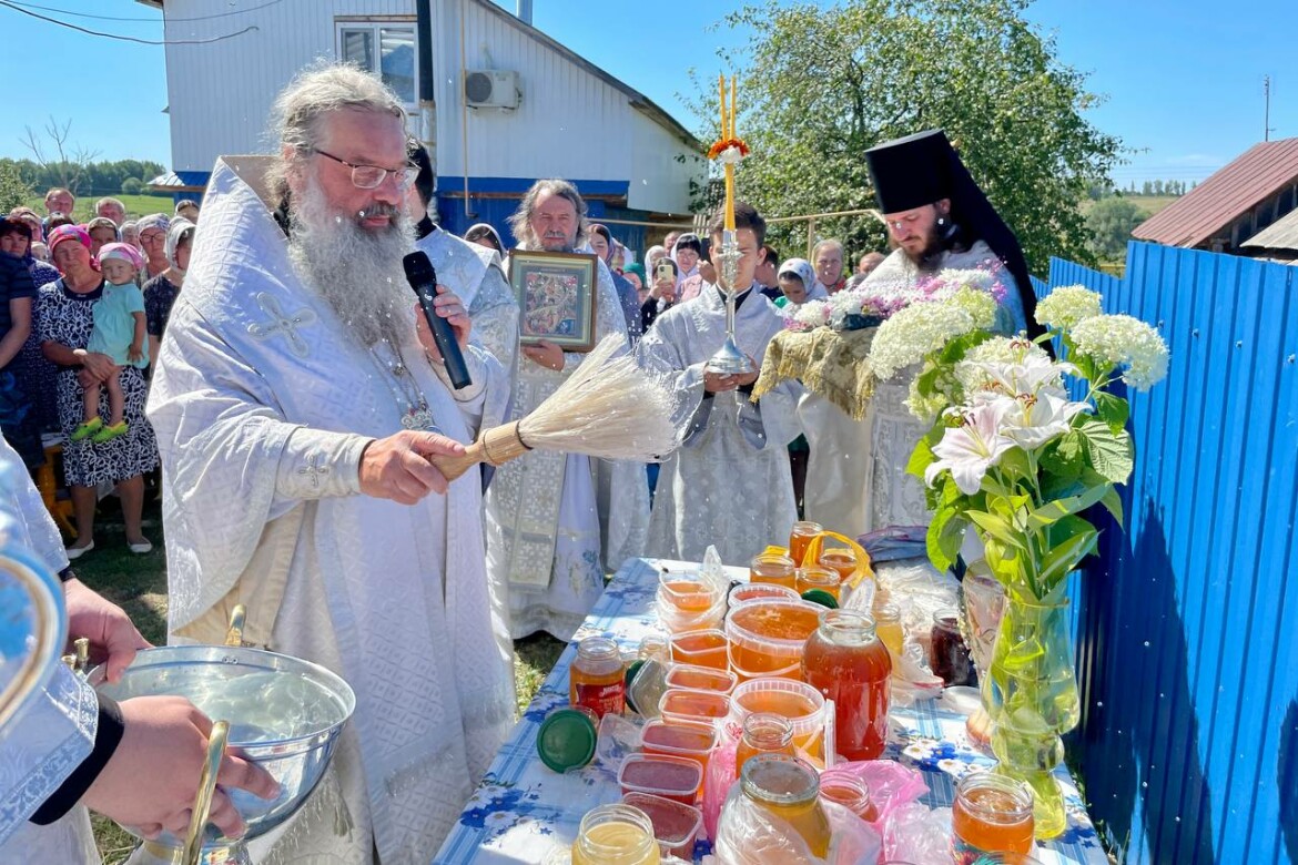 Затем владыка РТ возглавил в новоосвященном храме литургию. Завершив ее, во дваре храма он освятил мед нового урожая и вновь поздравил верующих с празднеством Всемилостивому Спасу и Пресвятой Богородице и началом Успенского поста.