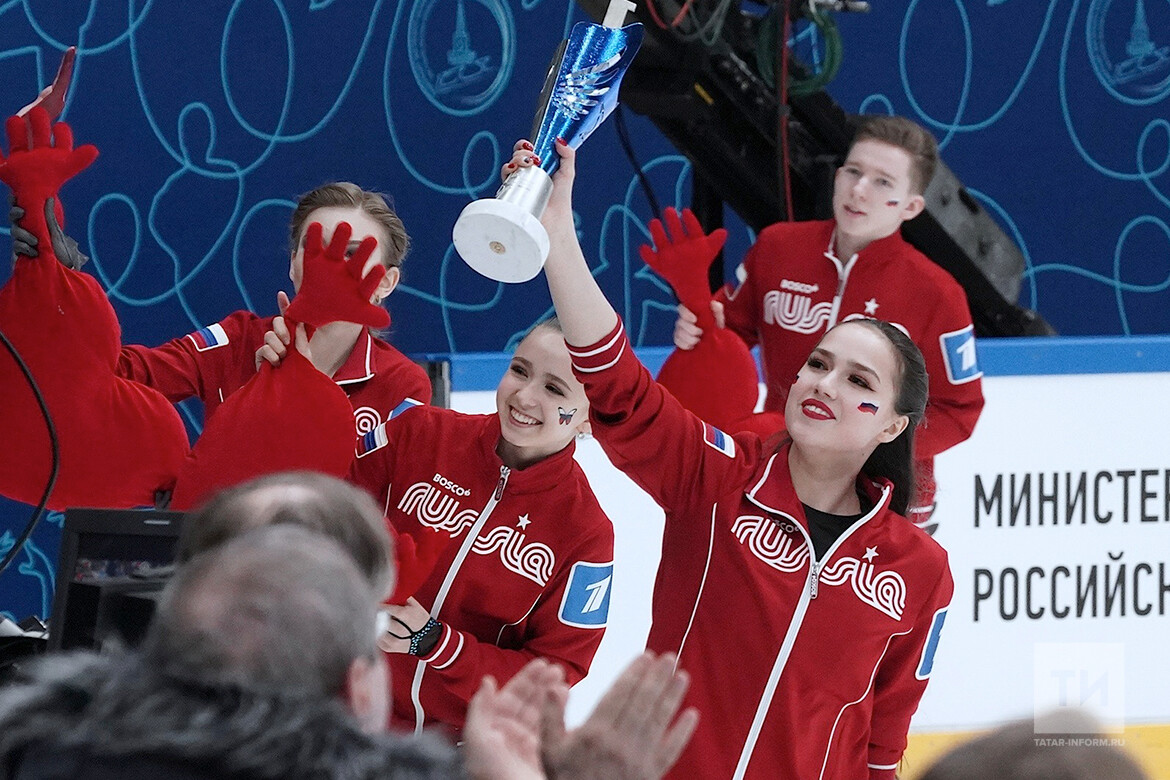 Валиева и Загитова после победы в командном турнире Кубка Первого канала в 2021 году