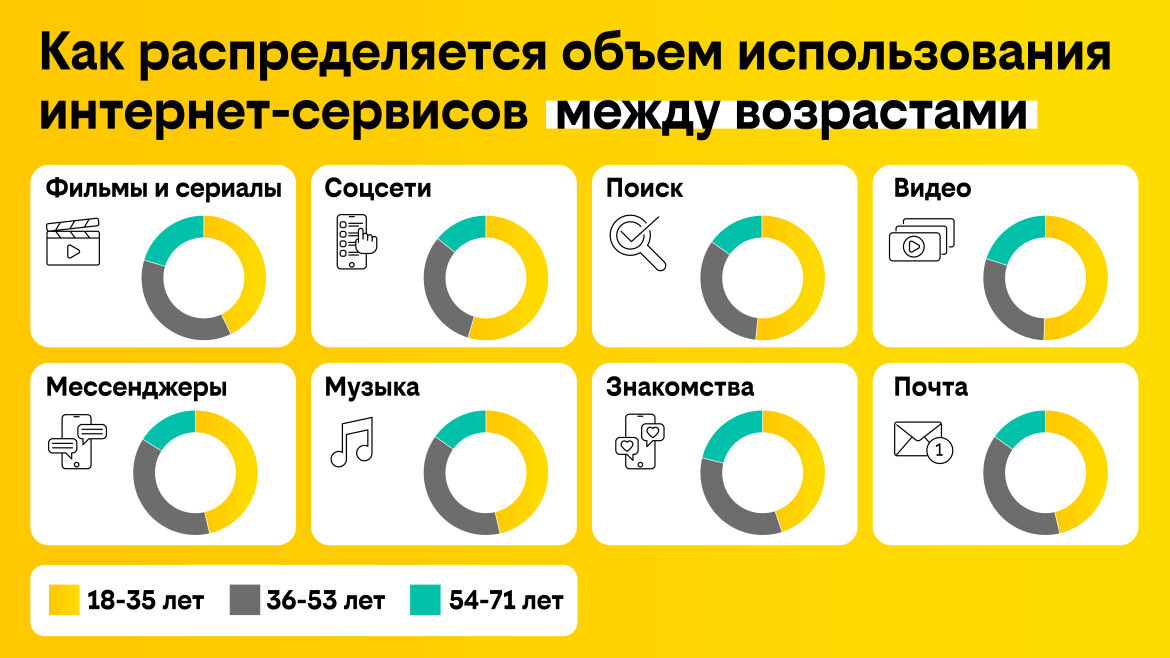 В целом молодежь использует почти на 30% больше трафика, чем люди среднего возраста, и в два раза больше, чем абоненты старшего возраста. Абсолютным лидером по использованию трафика для всех возрастов стали фильмы и сериалы – на них приходится около половины суммарного трафика.