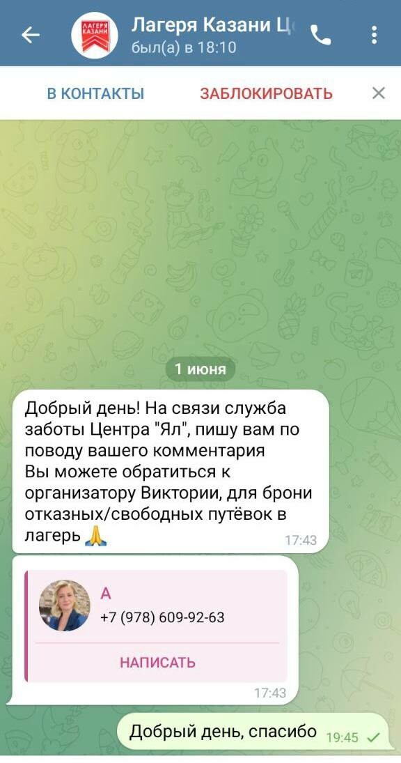 «Создаются аккаунты под нашим именем и с нашим логотипом, с которых поступают предложения о покупке путевки. Центр “Ял” не продает путевки через сообщения в мессенджерах! Просим вас быть бдительными и доверять только официальным источникам информации Городского центра “Ял”», – указано в телеграм-канале центра.