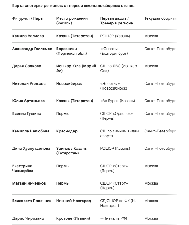 Как видно из таблицы, Татарстан и Пермский край являются крупнейшими «донорами» для столичных сборных. Ситуация, когда Пермь отдает готовую топ-пару (Чикмарева/Янченков) Москве, а Казань видит своих воспитанниц в куртках с гербом Петербурга, лишь подтверждает тезисы болельщиков: пока лучшие кадры из других городов будут «подтягиваться» в столицы для усиления их внутренних составов, развитие фигурного катания в стране будет оставаться географически перекошенным.
