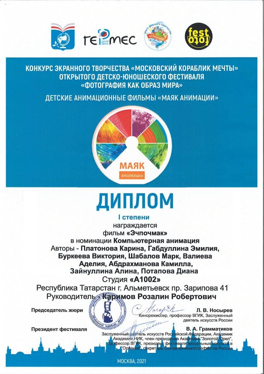 В Доме кино Москвы состоялось награждение в рамках фестиваля экранного творчества «Московский кораблик мечты». Команда школы анимации «А1002» из Альметьевска получила диплом I степени в номинации «Компьютерная анимация» за мультфильм «Очпочмак».