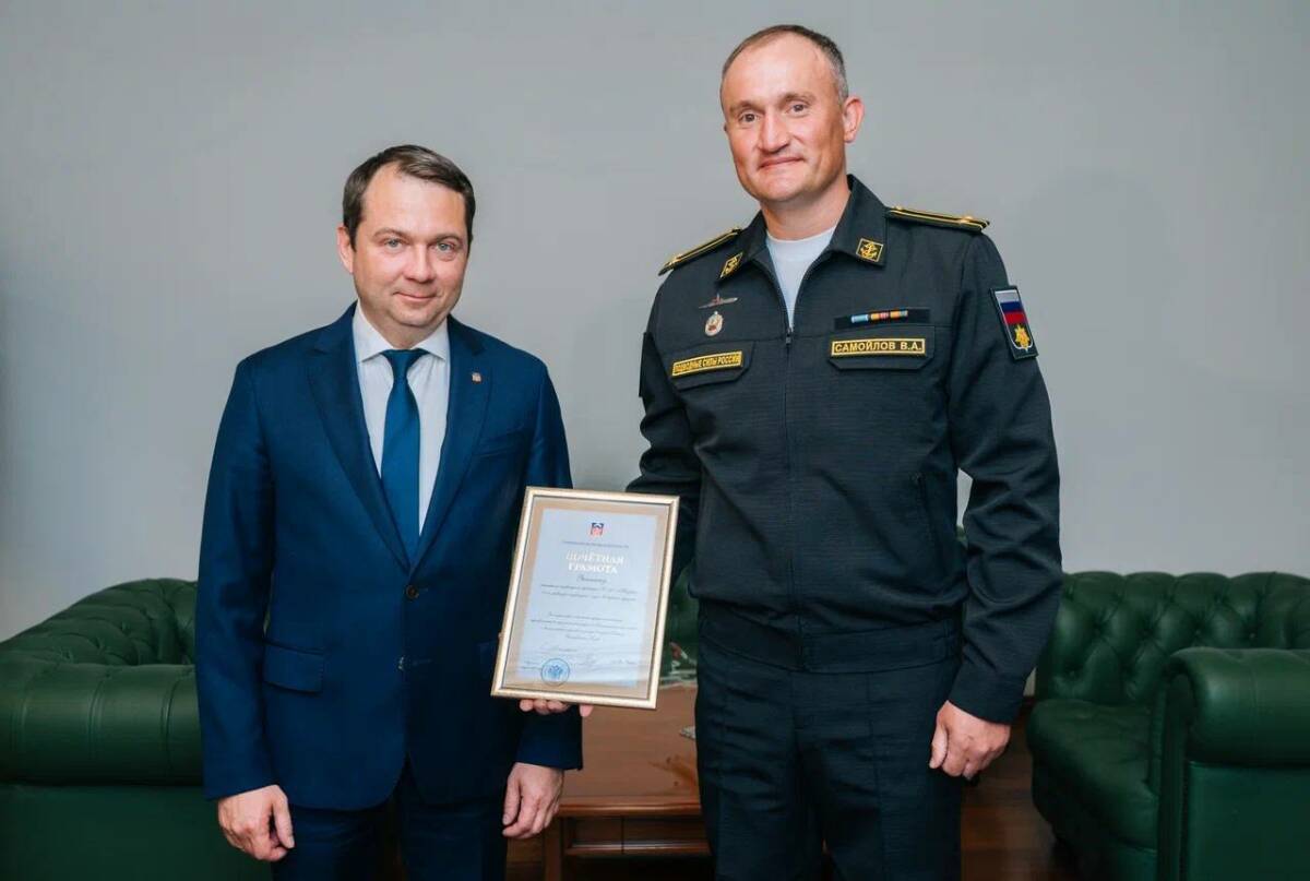 В ходе встречи с командиром атомного подводного крейсера К-561 «Казань» Вячеславом Самойловым руководитель региона передал экипажу корабля, входящего в состав 11-й дивизии подводных лодок Северного флота, почетную грамоту «за мужество и высокий профессионализм, проявленные в ходе решения задач в Атлантическом океане».