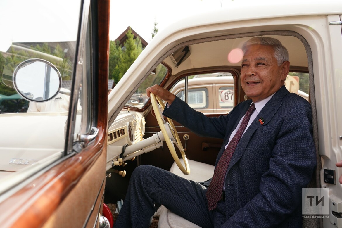 Он осмотрел выставку, поговорил с владельцами автомобилей и даже сел за руль раритетного автомобиля «Победа», который ежегодно участвует в параде Победы на центральной площади в Казани и до сих пор на ходу.