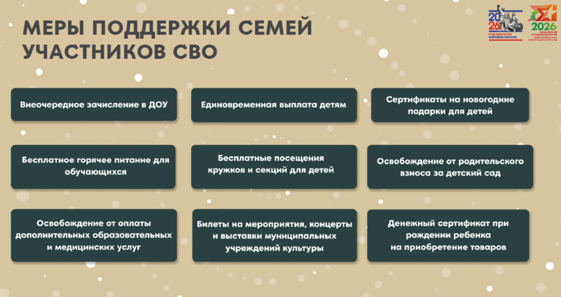 «Семьи военнослужащих окружаем заботой. Для детей в школах и садах предусмотрено первоочередное зачисление, бесплатное питание, посещение кружков дополнительного образования, отдых в лагерях», – отметила Хабутдинова.