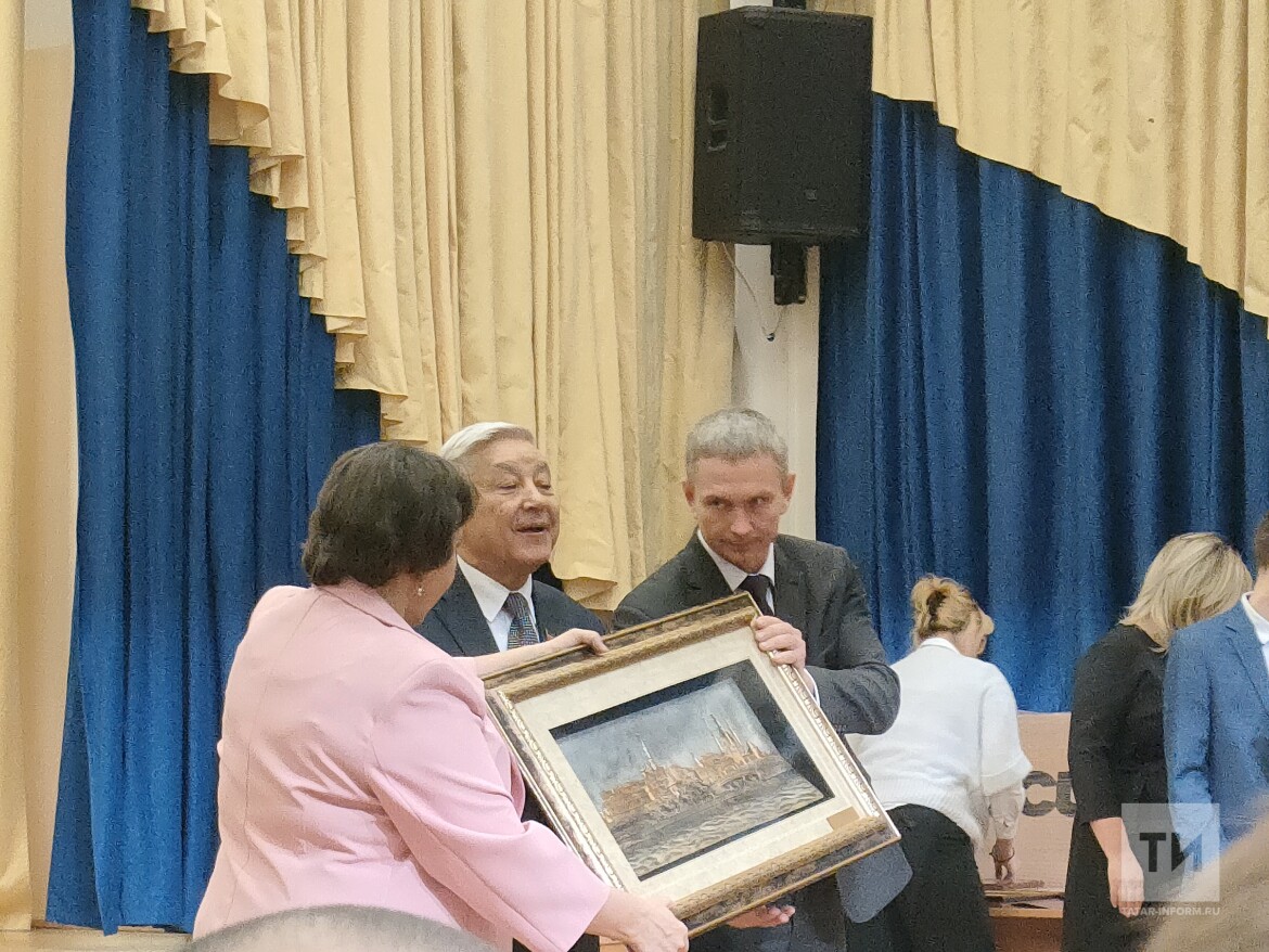 Мухаметшин также передал Шакировой поздравления от Президента РТ Рустама Минниханова и его личный подарок школе — интерактивную панель, а также вручил ей медаль «100 лет образования ТАССР». От своего имени Председатель Госсовета Татарстана подарил школе панно с изображением Казанского Кремля.