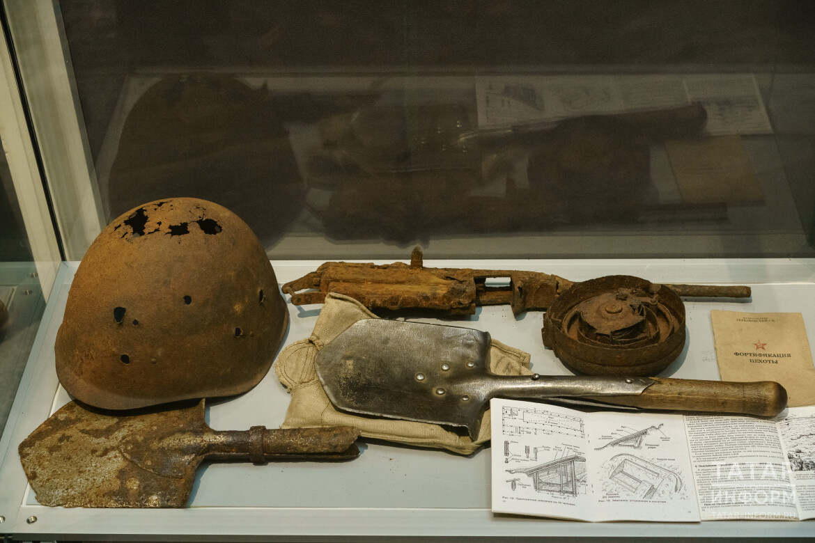 Также письма сослуживцев, телеграмма Иосифа Сталина адресованная колхозникам. Можно увидеть большинство предметов со времён войны — танковую педаль, мину, смотровую щель танкистов, инструменты. Все они были привезены с экспедиции», — сказал он.
