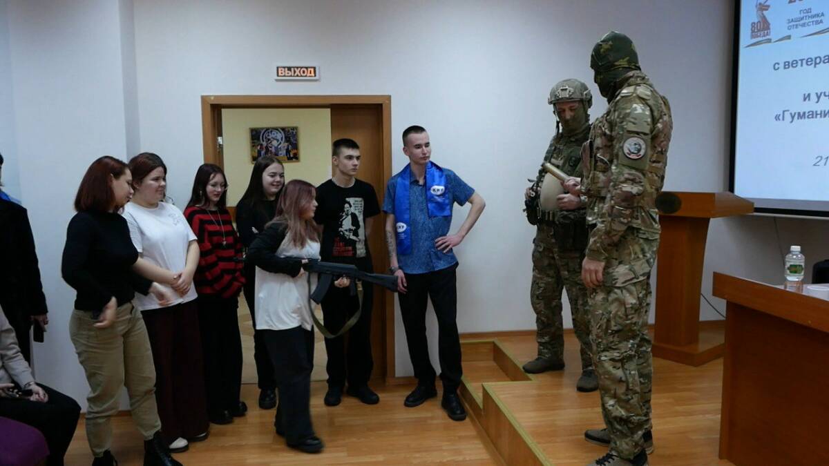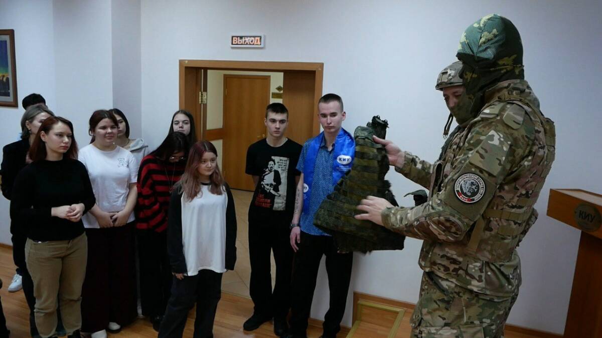 На встрече бойцы также рассказали и наглядно показали студентам их экипировку. Вес ее может достигать 50 кг. Военнослужащие показали и вражеские дроны.
