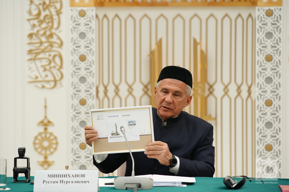 Следом выступил Рустам Минниханов. Интересно, что в своей речи он поделил присутствовавших на «хормэтле мофтилэр» (уважаемые муфтии) и «мофтилэр-дуслар» (муфтии-друзья). После традиционной благодарности Путину и Мишустину Президент отметил прошедшее заседание группы «Россия – Исламский мир». «Провели на достойном уровне, что отметили и исламские партнеры», – заявил он.