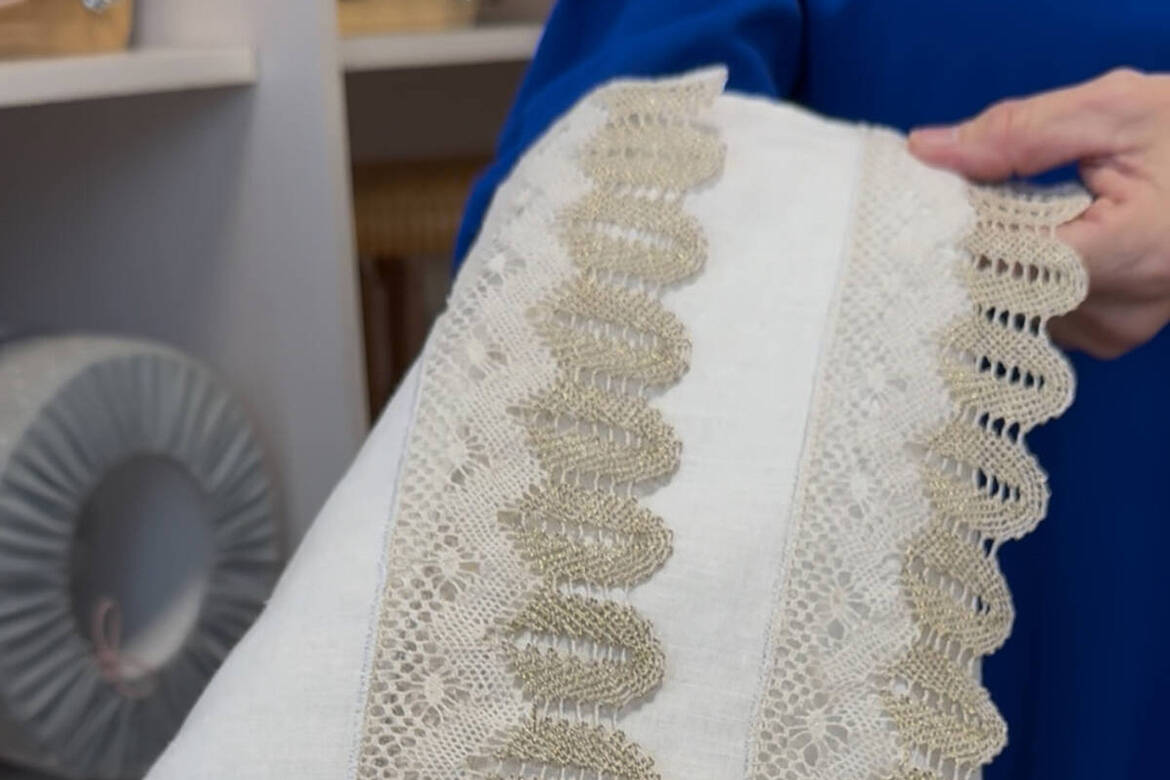 Рамзия апа обратила мое внимание на необычный образец – полотенце белого цвета, украшенное золотым кружевом. «Рыбнослободские кружева отличались оригинальным узором и техниками. Мы украсили это полотенце старинными узорами, характерными для нашего края. В проекте «Вышитая карта Татарстана» оно заняло свое место. Золотые нити придают этому полотенцу особое благородство», – замечает мастерица.