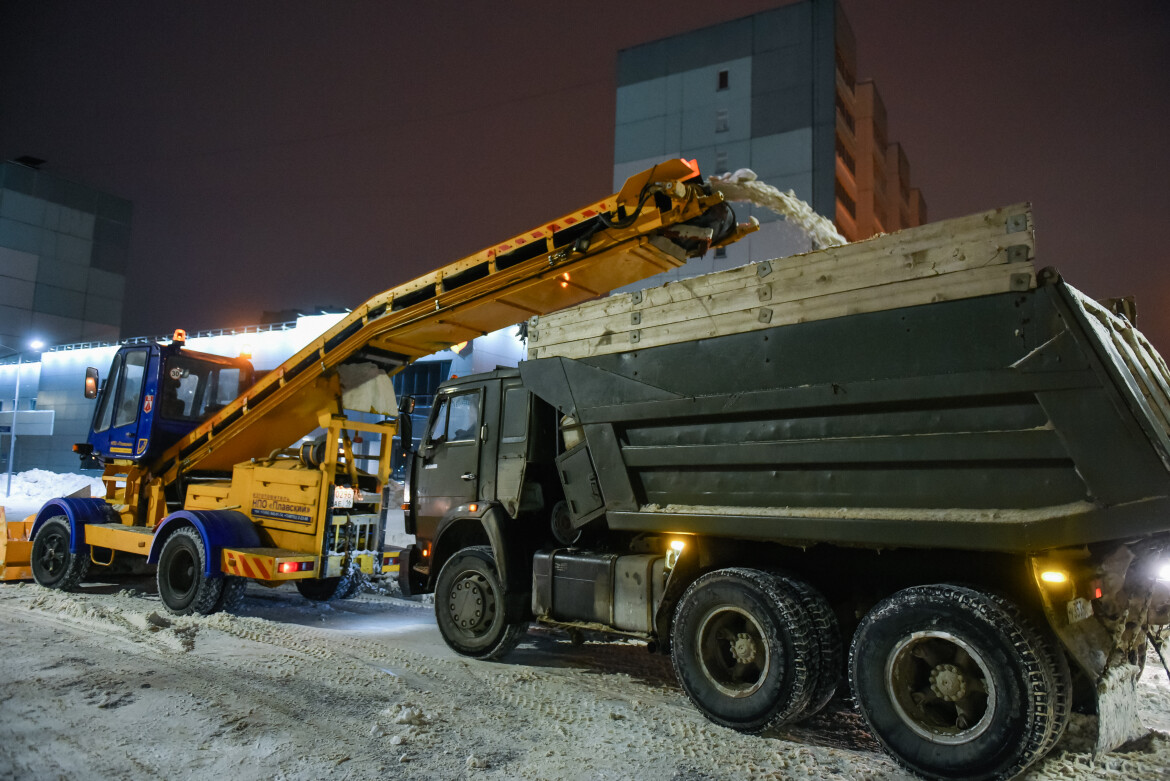 Сегодня в ночь вышли 86 единиц техники для уборки городских улиц: три снегопогрузчика, каждый из которых работает с пятью самосвалами, а также толкающие единицы.