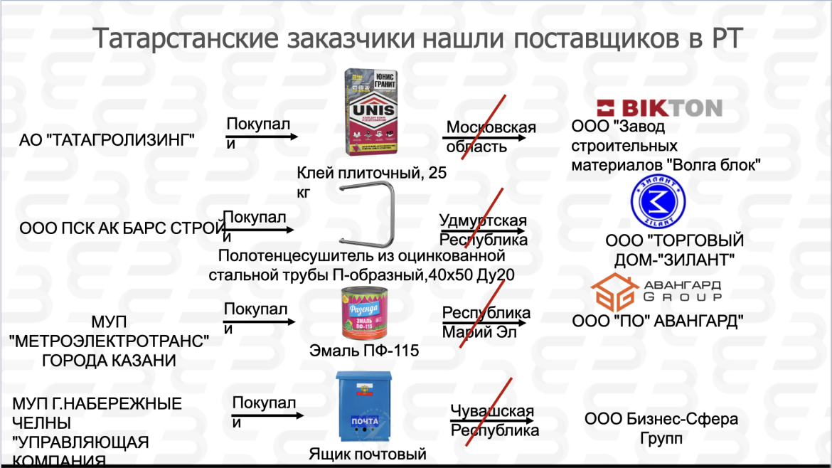 На сайте РМЦ также приводятся любопытные примеры того, как местные компании и бюджетные учреждения сумели по вполне конкретным товарным позициям найти поставщиков так же в Татарстане. Например, МУП «Управляющая компания Набережных Челнов» ранее закупало почтовые ящики в Чувашии, а теперь – у казанской компании «Бизнес-Сфера Групп». Санаторий «Васильевский» больше не заказывает эмалированные тазы в Ростовской области, а покупает их у Кукморского завода металлопосуды, а МУП «Горэлектротранспорт» приобретает веники сорго прошивные не в Воронежской области, а у местного ИП.
