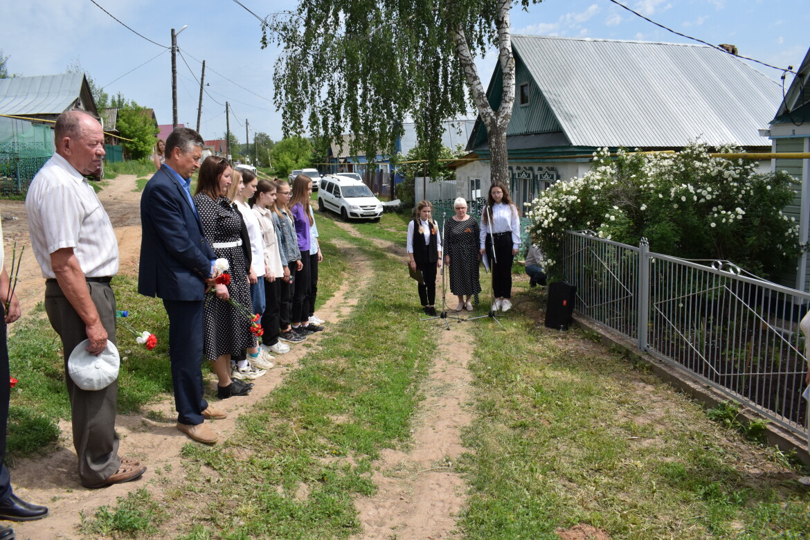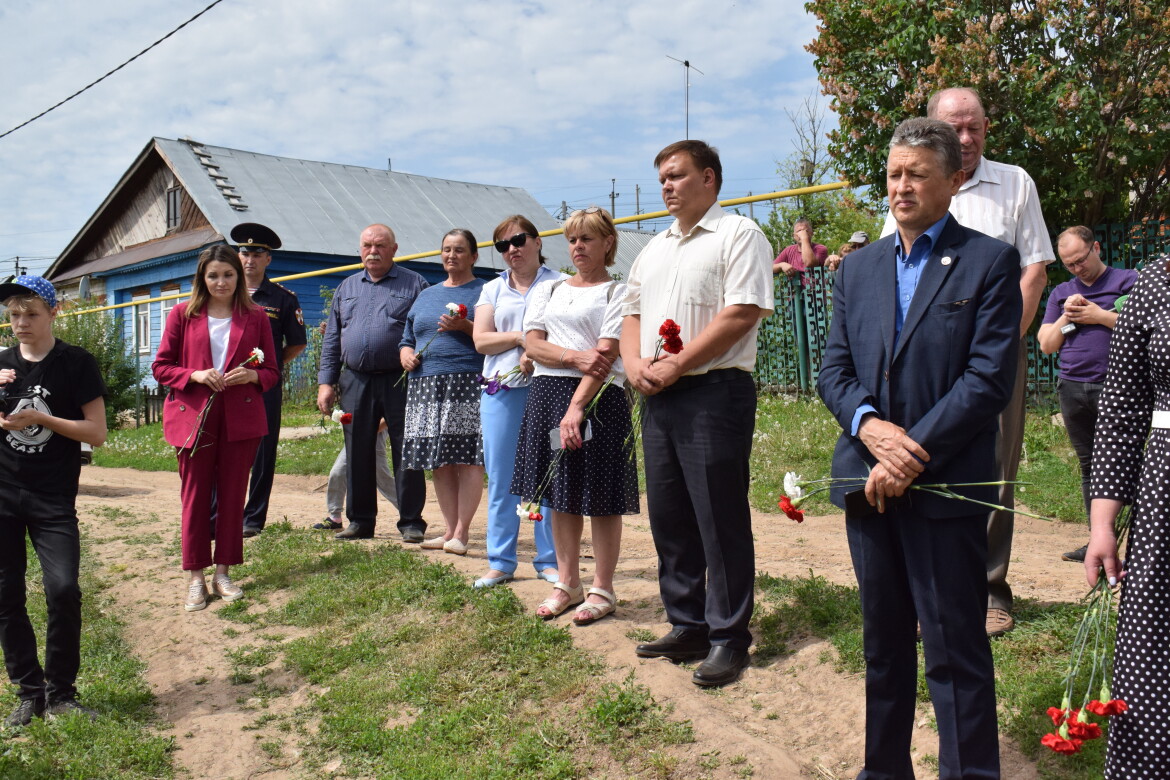 Ларисе Козиной предоставили почетное право открыть мемориальную доску. Собравшиеся возложили цветы к мемориальной доске на доме Героя России Алексея Козина.
