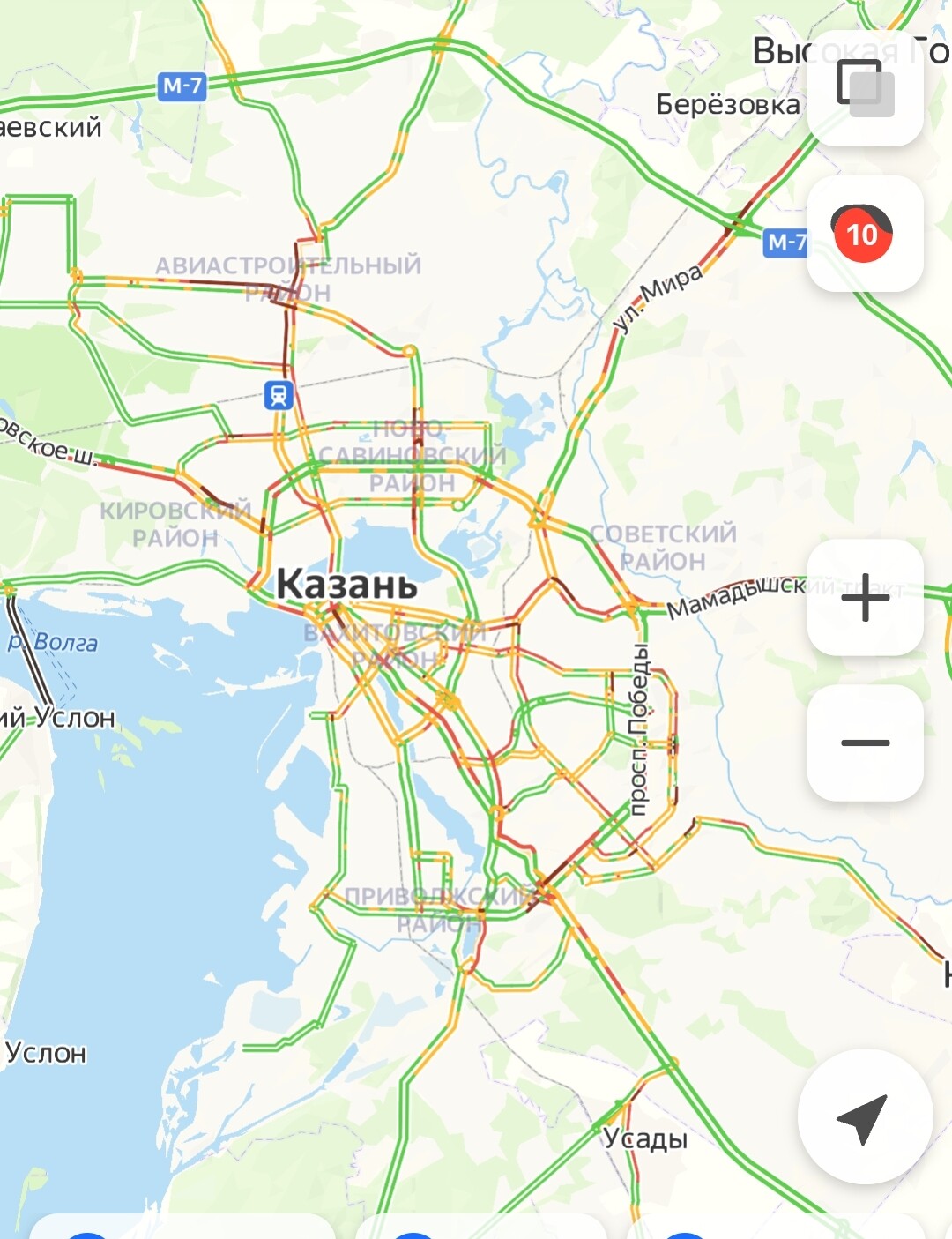 Из-за сильной метели и обильного снегопада на дорогах Казани обрадовались пробки 10 баллов. Информация взята с сервиса Яндекс.Пробки.