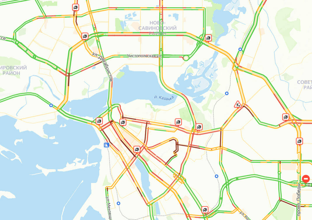 Движение на центральных улицах города замедлилось до минимума, а многие водители оказались в заторах на несколько часов. Крупные заторы также образовались на Мамадышском тракте, проспекте Победы, Аграрной улице и на участке в сторону Дербышек.