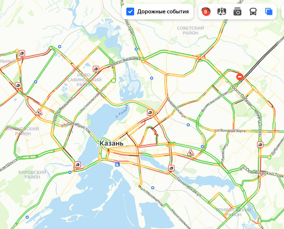 Казанцы стоят в пробках на улицах Пушкина, Салимжанова, Тукая, Лево-Булачной, Татарстана, Ершова, Гагарина, Воровского, Бутлерова и других. Заторы наблюдаются практически во всех районах города.
