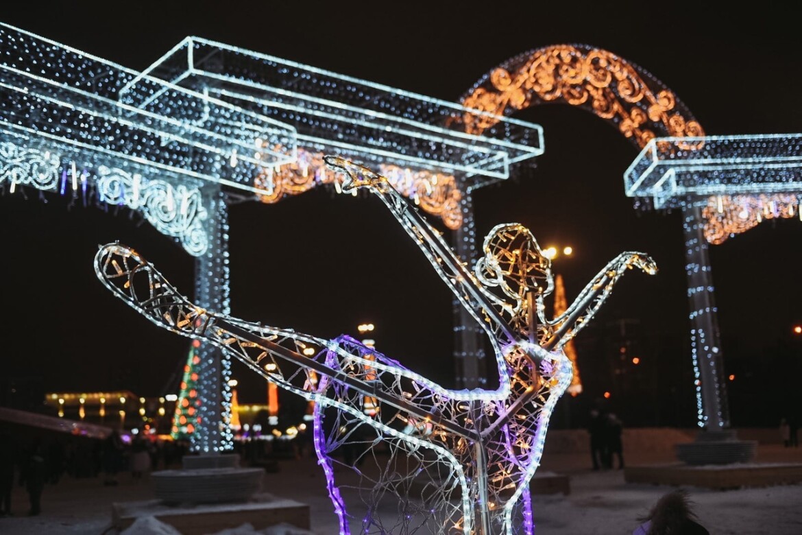 Вся площадь засияла огнями, музыкой. Подсветка в виде конфет и хлопушек появилась на столбах освещения, деревья украшают цветные огни.