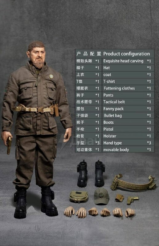 Отмечается, что корпус фигуры будет подвижным, а на голове будет прическа с «изысканной резьбой». Игрушечный Кадыров будет в полном обмундировании: в комплекте есть кепка, пальто, футболка, брюки, тактический ремень, сумка на пояс, сапоги, пистолет, кобура.