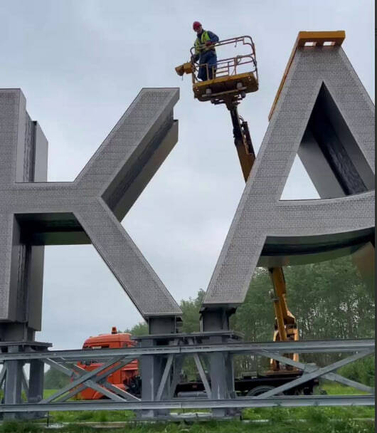 Отмечается, что высота букв составит 4 метра – сейчас их монтируют на месте. Они покрыты нержавеющей сталью и алюминием в боковой части, элементы, в том числе герб, украшены стилизованной перфорацией, которая будет сиять в сочетании с двумя видами подсветки.