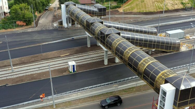 Близится к завершению строительство надземного пешеходного перехода по улице Борисковская. В частности, на лестницах смонтировали наклонные подъемники, предназначенные для инвалидов-колясочников. На всей пешеходной части уложили износоустойчивое напольное покрытие.