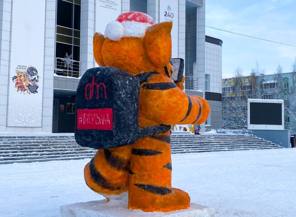 Полосатая фигура расположена на постаменте из снега. На голове у Тагира шапочка Деда Мороза, за спиной рюкзак-мерч с логотипом Дворца Молодежи и хештегом Бугульма. Он широко улыбается, а в левой лапе телефон, на который он делает селфи.