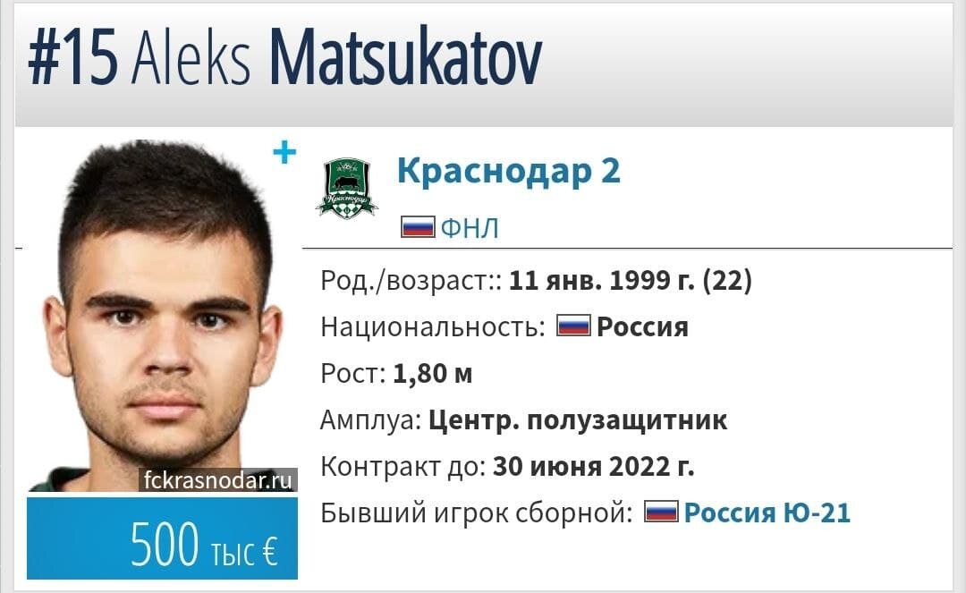 22-летний полузащитник «Краснодара» Алекс Мацукатов находится на просмотре в казанском «Рубине». Этот игрок вышел на поле в составе казанского клуба во втором тайме контрольного матча против «Урала», который завершается в эти минуты в Екатеринбурге. (Пока казанцы уступают хозяевам со счетом 0:2).