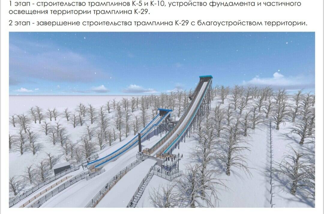 Кроме того, планируется строительство двух малых трамплинов – K-5 и K-10, где цифры обозначают расстояние в метрах, которое должны преодолеть спортсмены при прыжке с них.