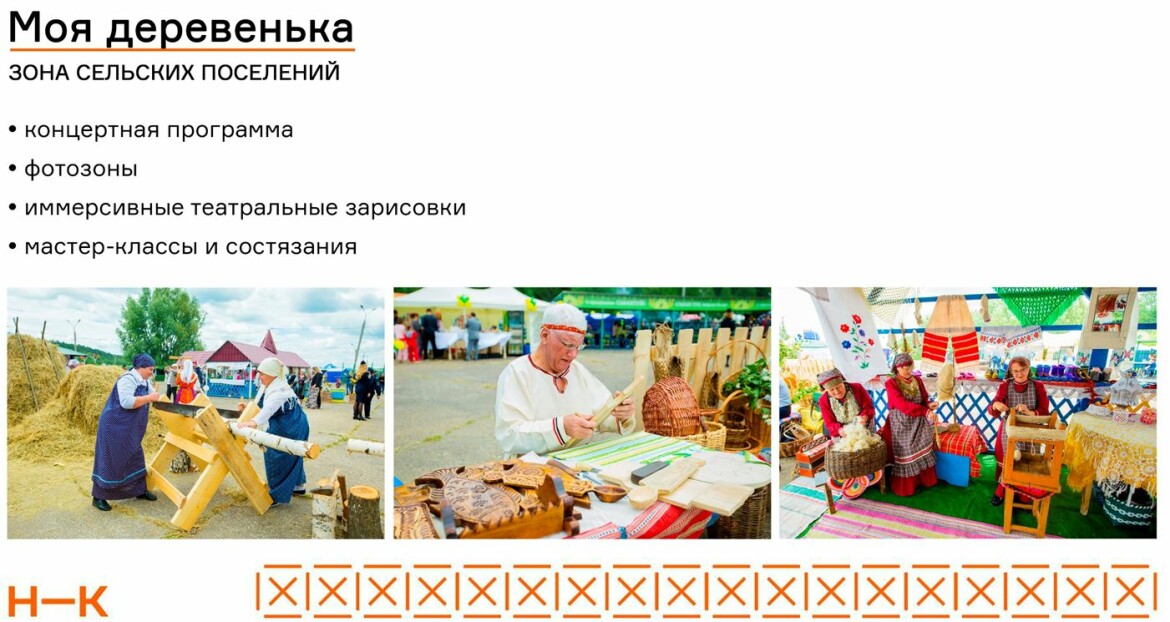 Представители сельских поселений Нижнекамского района предлагают гостям тематическую интерактивную площадку «Моя деревенька» — «Авыл тормышы», демонстрирующую жизнь, обычаи, культуру татарской деревни.