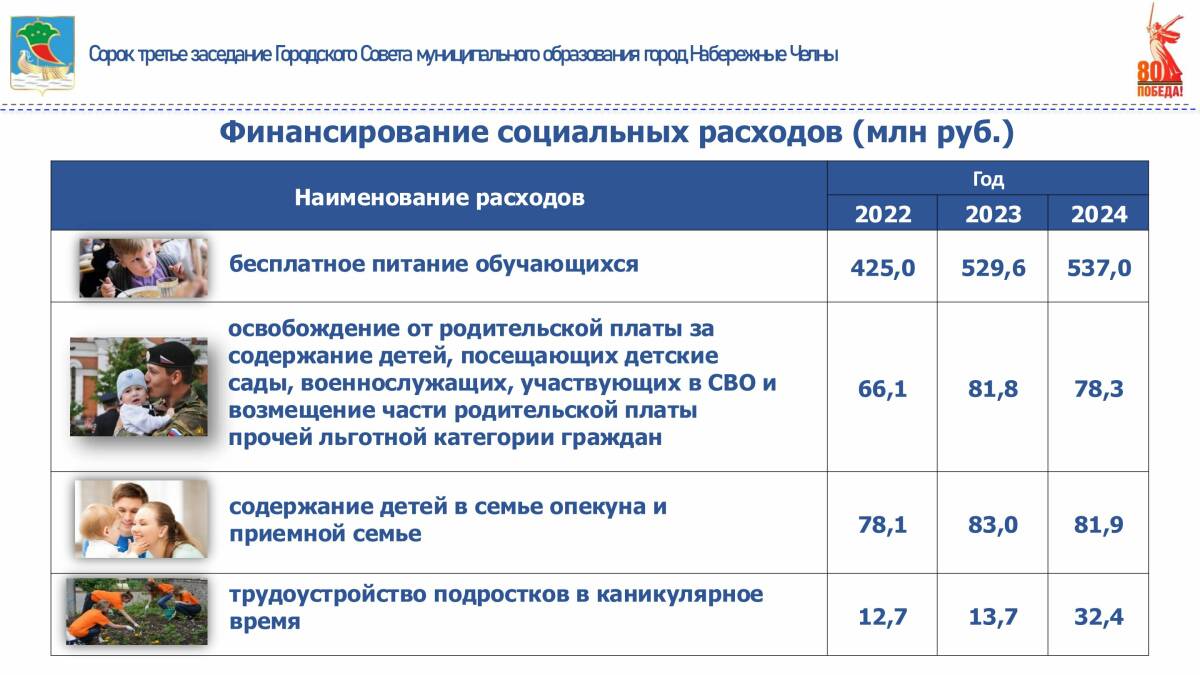На социальную политику в 2024 году выделено 999 млн рублей. Эти средства распределены по различным направлениям, включая 537 млн рублей на обеспечение бесплатным питанием школьников из семей участников СВО, детей-инвалидов, учеников с ОВЗ, из многодетных семей и всех учащихся 1-4 классов. Кроме того, 78 млн рублей направили на освобождение от родительской платы за детсад для семей участников спецоперации и частичное возмещение платы для других льготных категорий граждан. Еще 82 млн рублей выделили на содержание детей в семьях опекунов и приемных семьях.