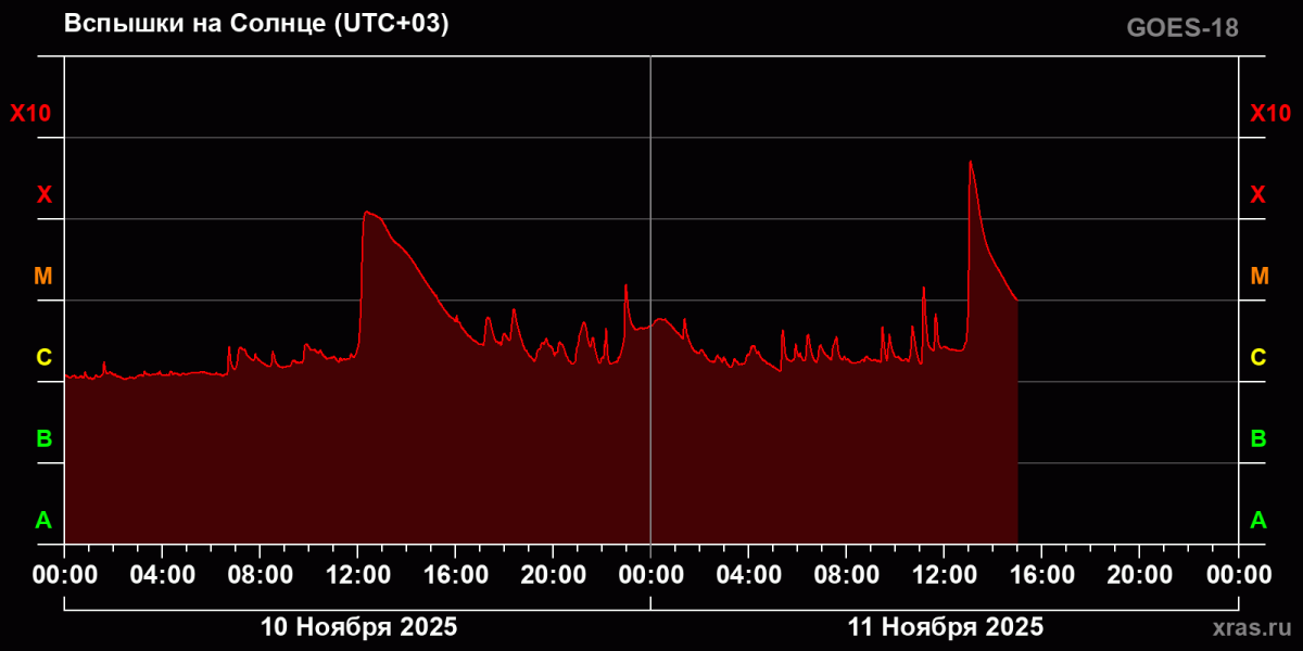 По информации специалистов лаборатории, максимум события был достигнут в 13.04 по московскому времени. По потоку излучения оно в 3–5 раз превышает все вспышки этого года, а по энергии – в 10–20 раз (оценочно).