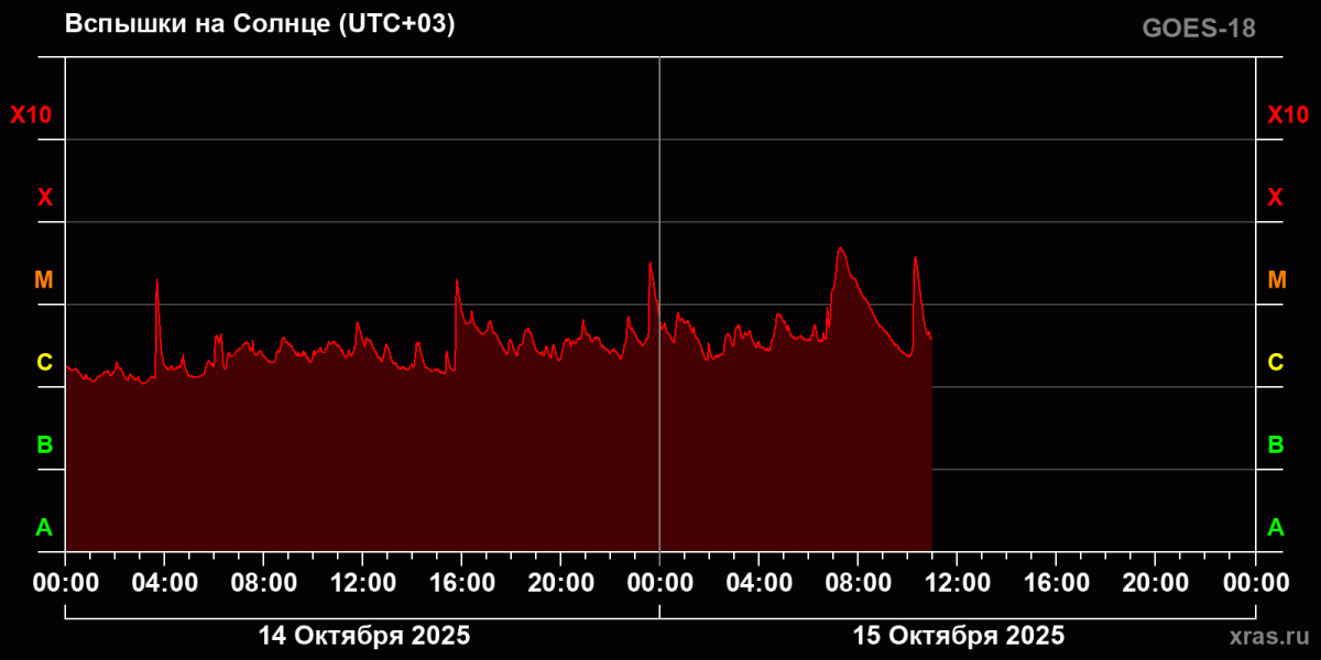 По информации Лаборатории солнечной астрономии, сегодня может быть достигнут многомесячный пик по силе солнечных вспышек. Графики показывают непрерывный рост фонового излучения светила: за сутки оно увеличилось в четыре раза и приблизилось к уровню М. Таким образом, даже в отсутствие взрывов Солнце формирует потоки рентгеновского излучения на уровне сильных вспышек, уточнили исследователи.