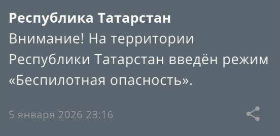 В Татарстане в 23.16 ввели режим беспилотной опасности. Соответствующее сообщение появилось в приложении МЧС России.