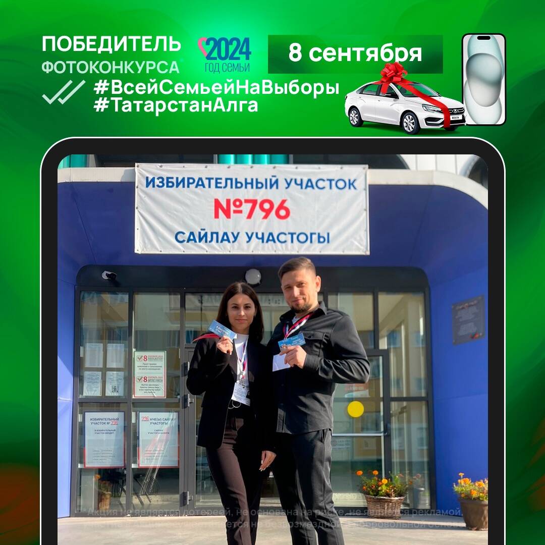 Он также напомнил, что для участия в конкурсе нужно сделать фотографию со своей семьей на фоне избирательного участка (именно снаружи, а не внутри здания), в специальном браслете, который могут получить проголосовавшие в Республике Татарстан. На фотографии должен присутствовать узнаваемый элемент входной группы избирательного участка: надпись, плакат или баннер. Браслет должен быть виден на фото как минимум у одного человека, достигшего 18-летнего возраста.